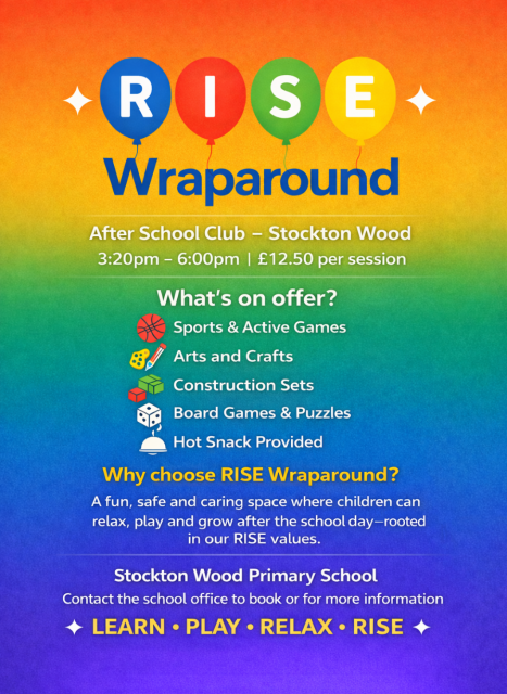 Stockton Wood Primary School offers after school care from 3.20 – 6.00pm, Monday – Friday. All pupils in Reception – Year 6 are welcome to attend. The cost is £12.50 per day, bookings must be made via Arbor.