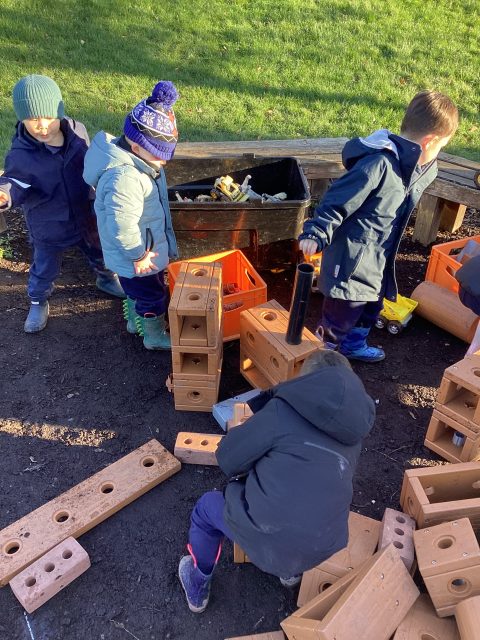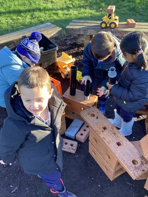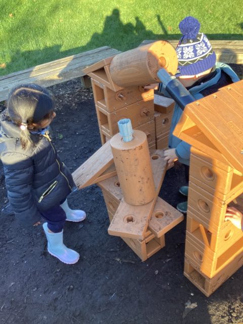 We’ve made our own car tracks and tunnels with some tubes and boxes today! We balanced the tubes on the furniture and drove our cars down to see how fast they could go! We had to work as a team.