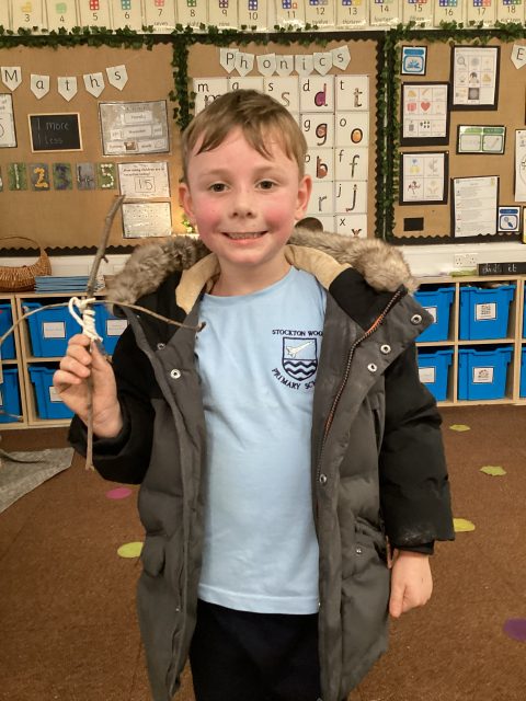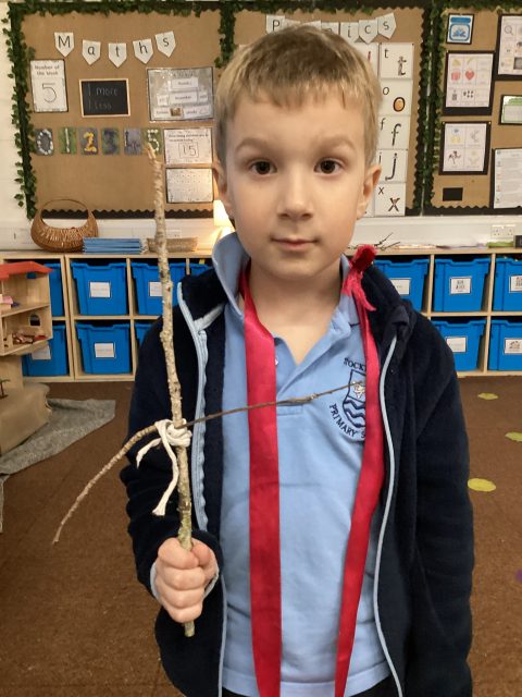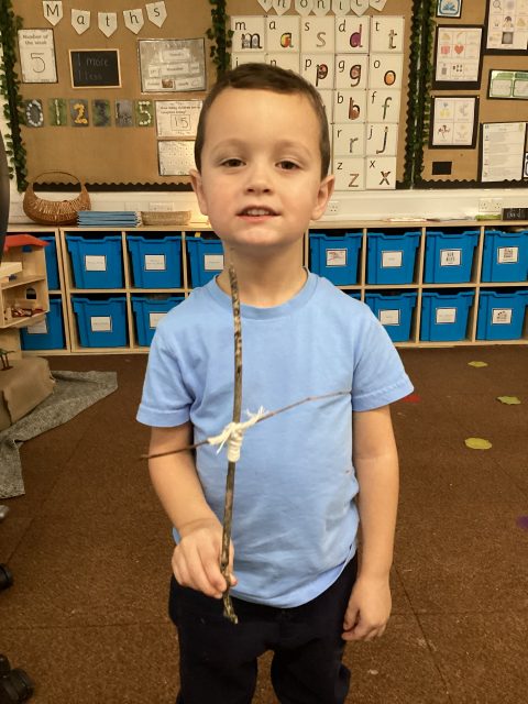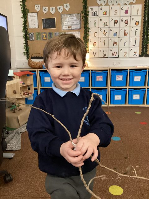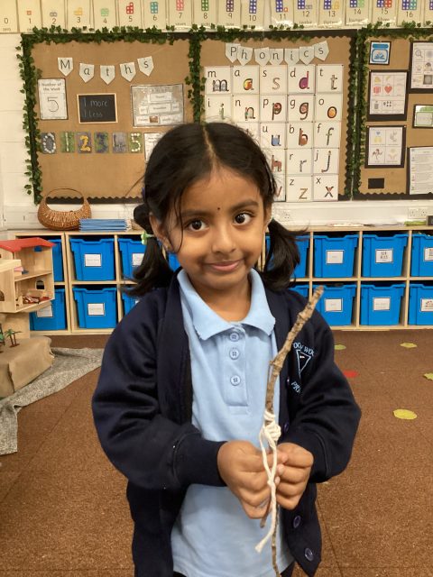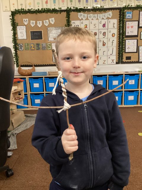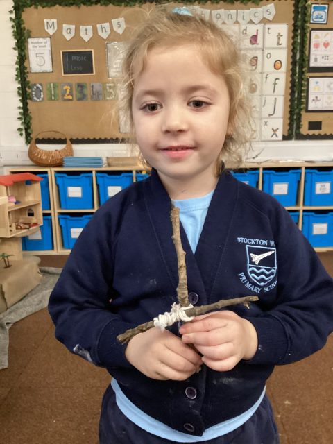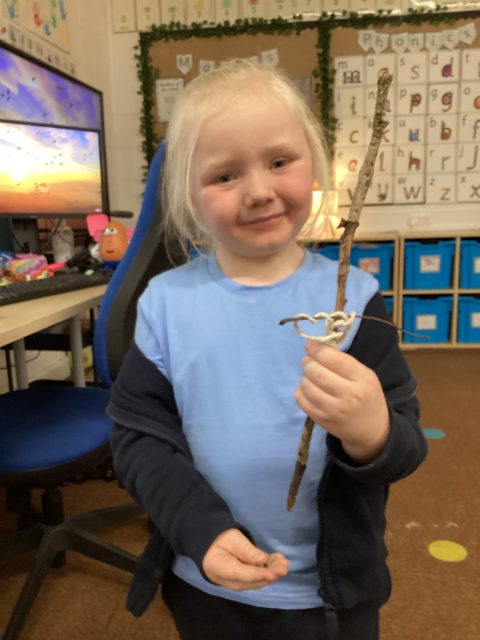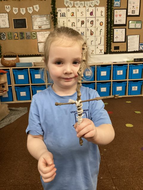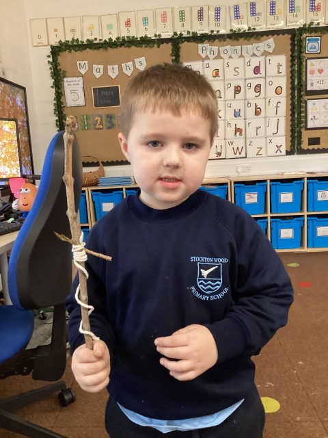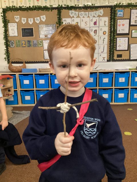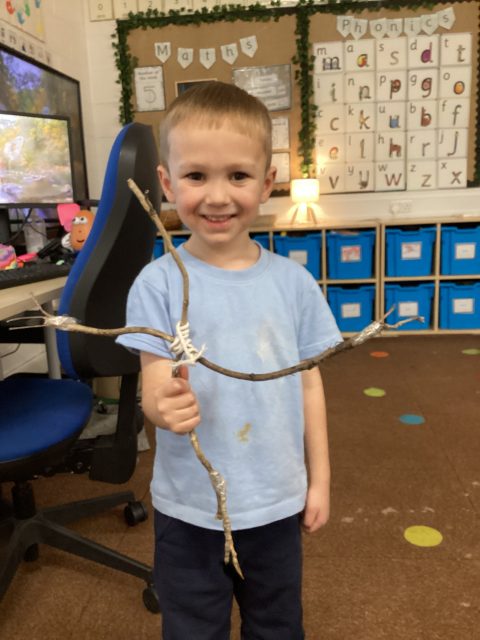 This week we also explored the book Stick Man. We went into our outdoor environment to collect sticks, which we used to make our very own Stick Man models. Using our DT joining skills, we attached the sticks together with string. Finally, we added faces to complete our Stick Man.
