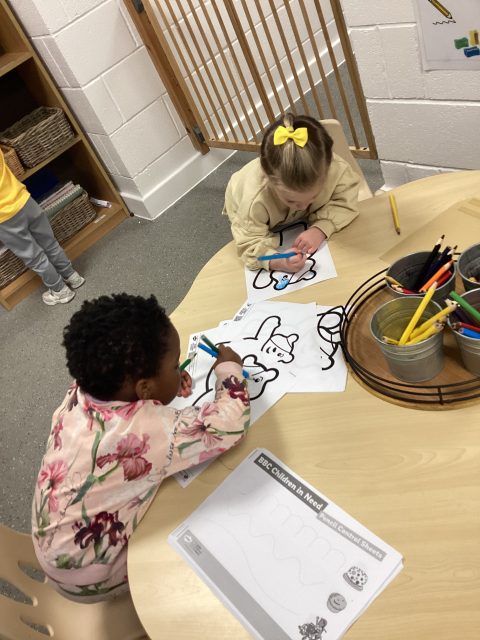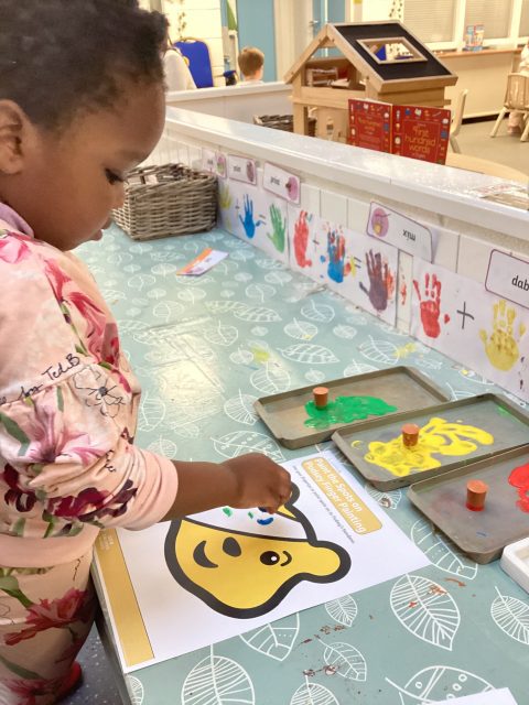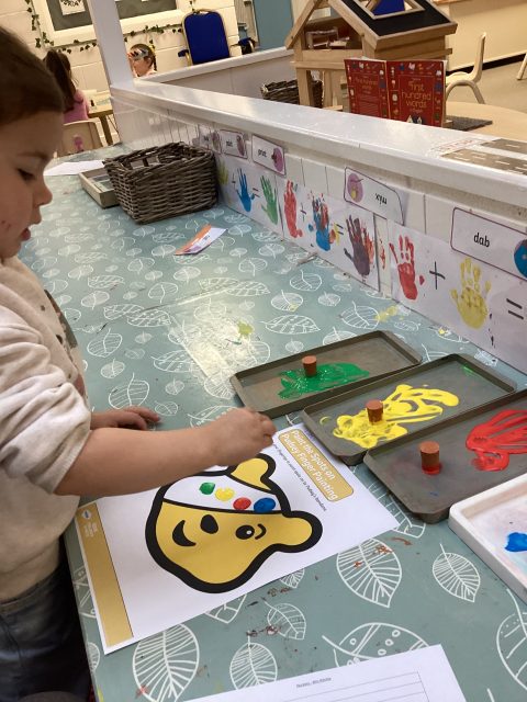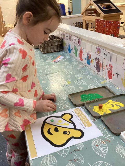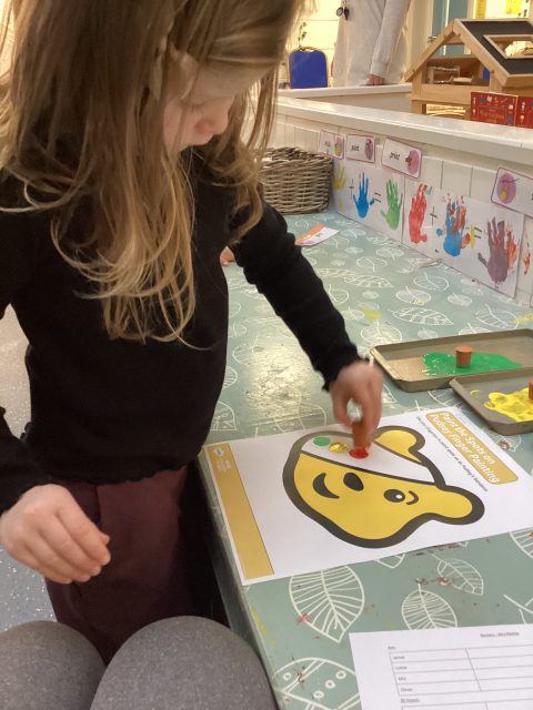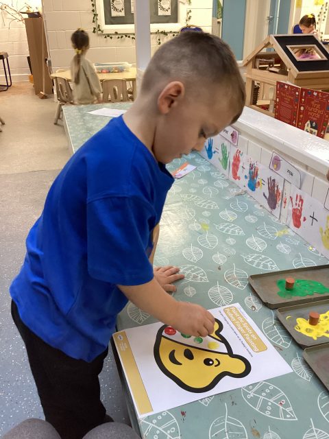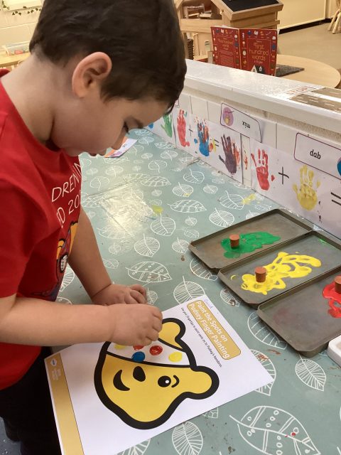 We have had a lovely start to Pudsey day! We have done some PE with Joe Wicks and Pudsey, and have enjoyed some printing – Pudsey’s eye patch was missing its spots!