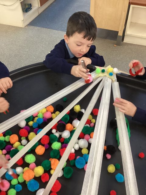 We further consolidated our learning about patterns, and printed some using cotton reels. This proved trickier than we thought, as we had to really concentrate on which reel we were picking up. Some children then even recreated their own patterns in provision independently!
