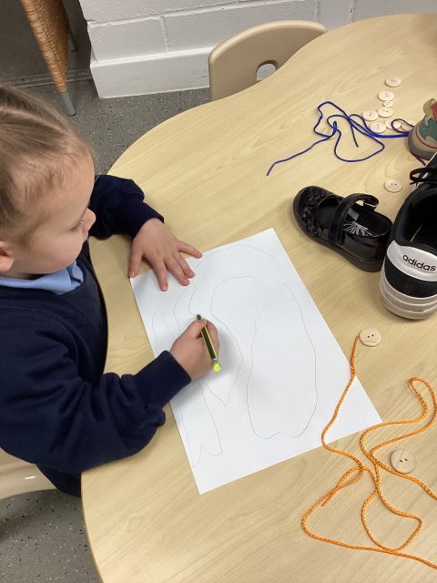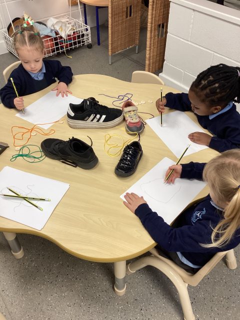 Our first art week activity: sketching shoes! Our driver text this half term is The Elves and the Shoemaker, so we decided to try sketching our shoes, just like a shoemaker would when they were designing them. We looked closely at the details and shapes we could see.
