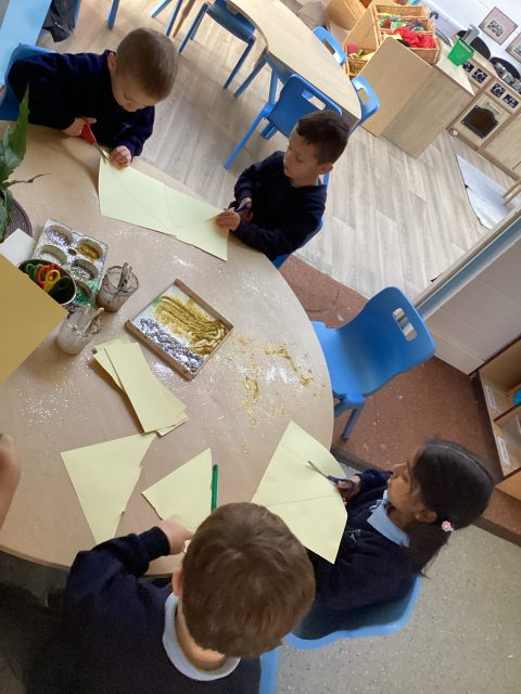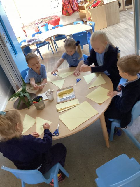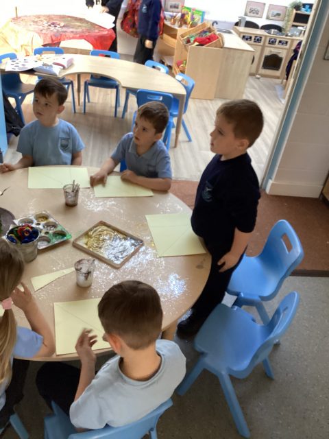 Reception have been exploring shapes. We have made our own stars by cutting rectangles and triangles out and gluing them together. We have also been on a shape hunt searching for squares and rectangles.