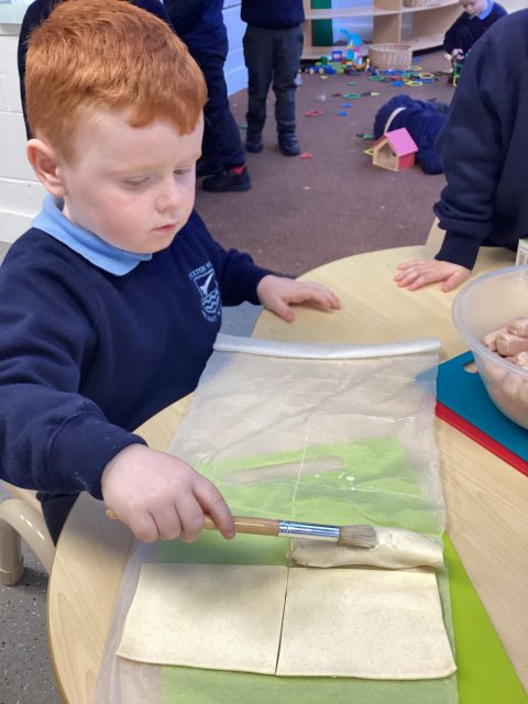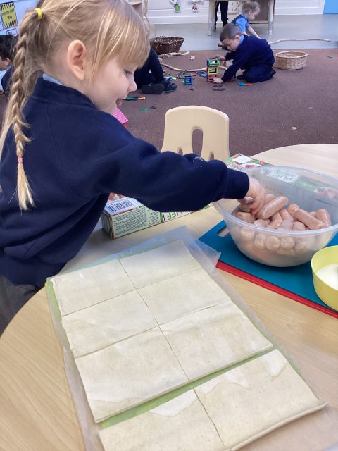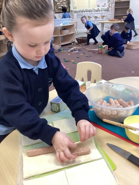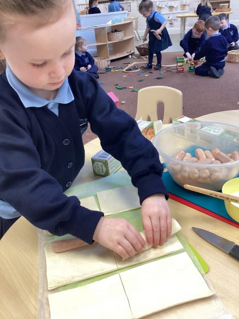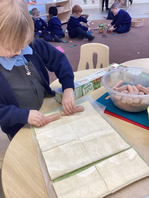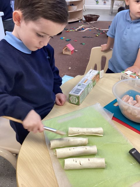 We enjoyed making our own sausage rolls in our cooking session this week. We had to carefully roll the pastry around the sausage, then brush them with milk! This was trickier than it looks, and some of them kept tricking us by unrolling themselves! We then enjoyed them at snack time (some children enjoyed some delicious meat free rolls too 🥰)