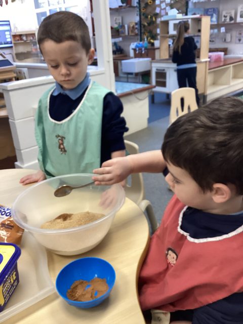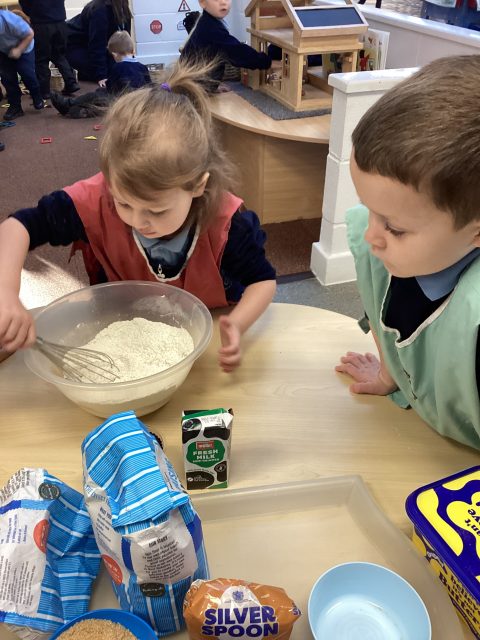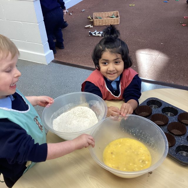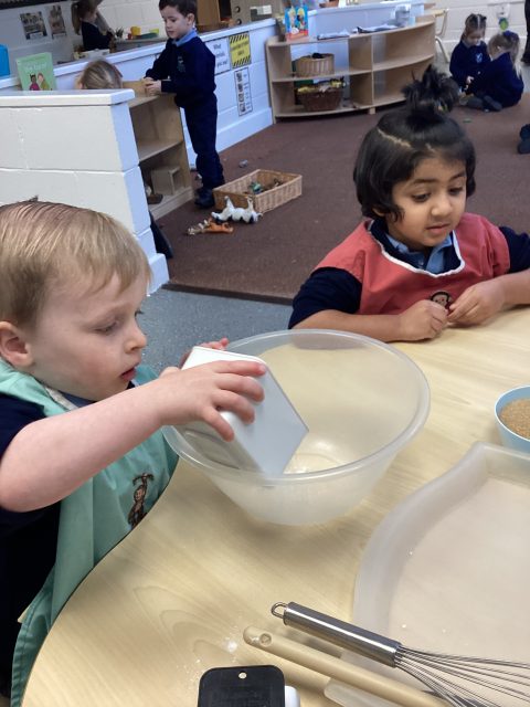 Mrs Sefton made us smile today…we walked into Nursery and spotted the scales and baking ingredients and we knew straight away it was time for big cook, little cook! We weighed all the ingredients, and carefully mixed them together to make lemon tarts! We enjoyed eating them at snack time.