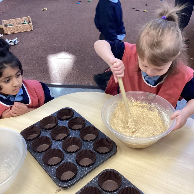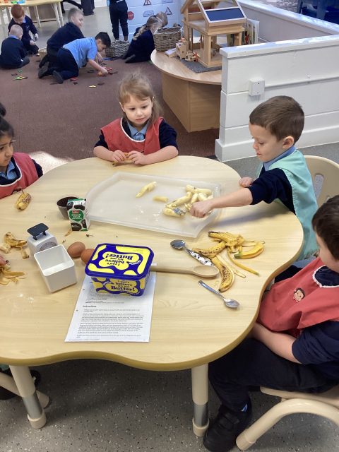 This week, we made banana muffins! We carefully weighed out the ingredients…but mashing the bananas was definitely our favourite bit! They really were delicious 😋