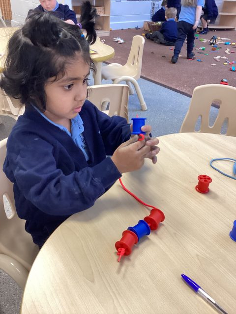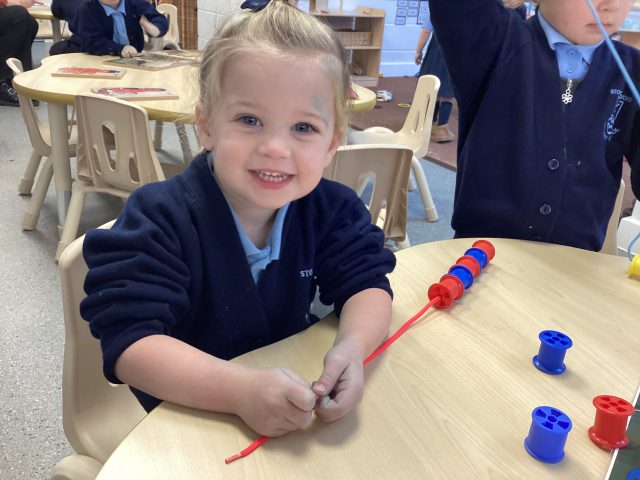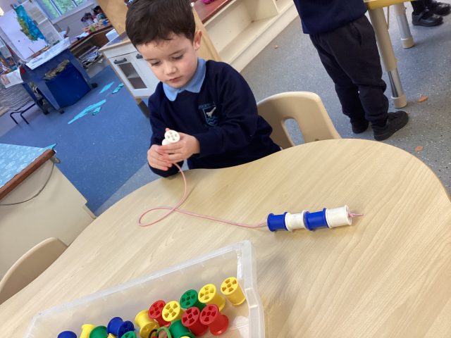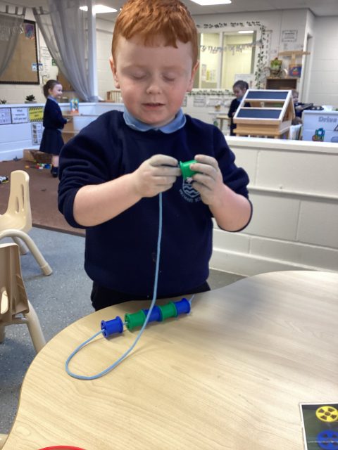 In maths, after learning all about number two, we are now learning about patterns that have two attributes. We now know that for a pattern to work, the attributes have to take turns! We made a pattern on our carpet of girls and boys, and then consolidated in small groups making a threading pattern, which doubled up as an excellent work out for our fingers!