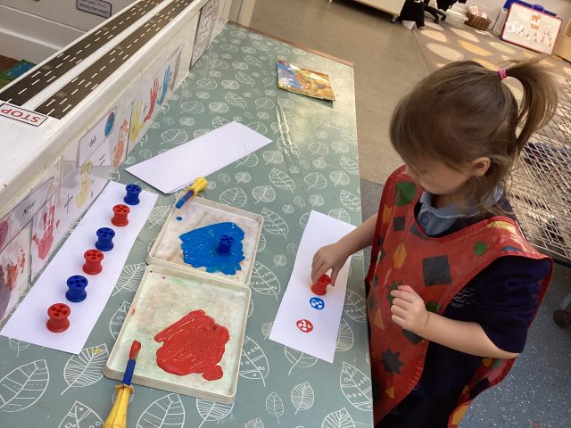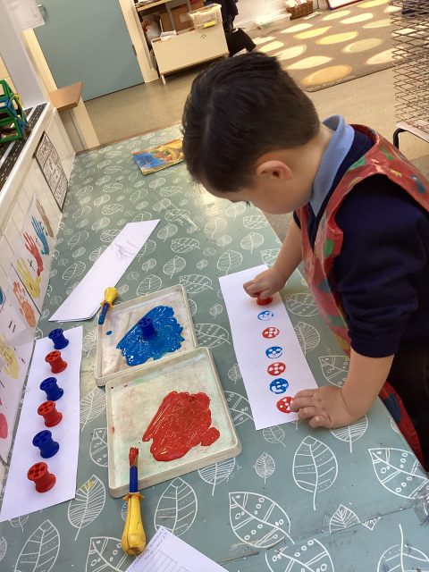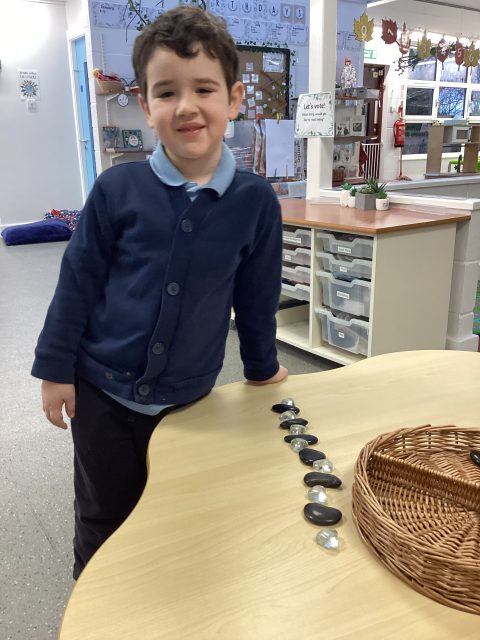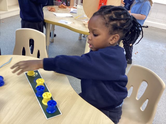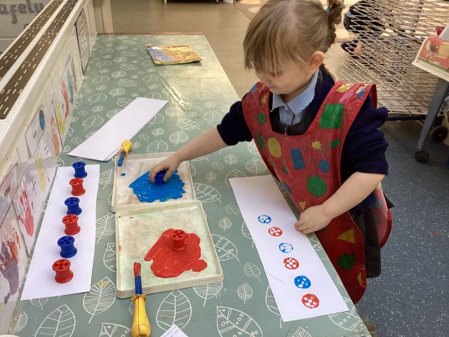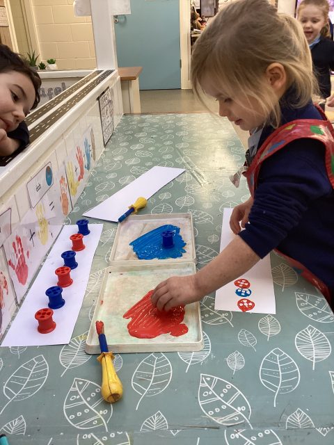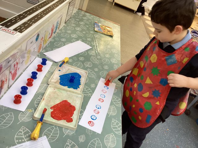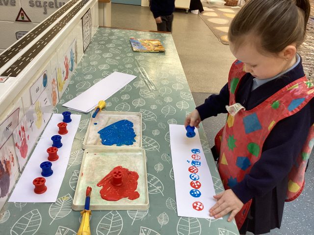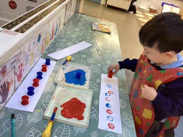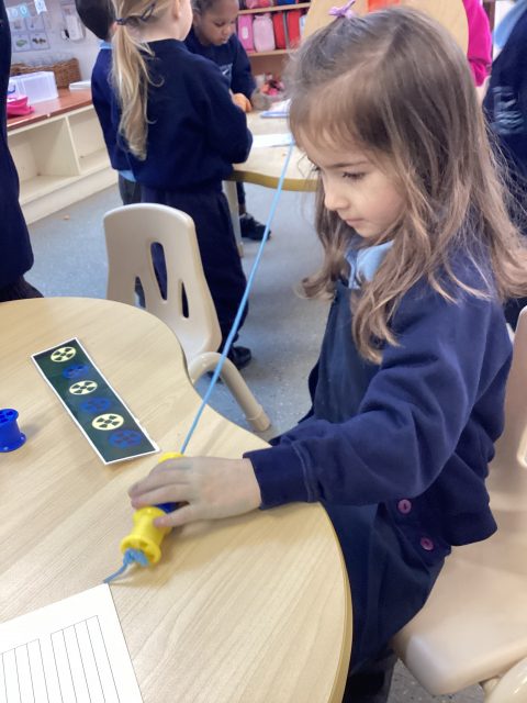 We further consolidated our learning about patterns, and printed some using cotton reels. This proved trickier than we thought, as we had to really concentrate on which reel we were picking up. Some children then even recreated their own patterns in provision independently!