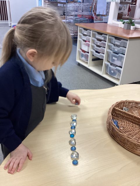 We are having a brilliant day celebrating maths party day 🎉 we started our morning off with some number songs – our dance moves were just as amazing as our counting! We then got on board the maths train, and made a pattern. We talked about the different colours taking turns to make sure the pattern was correct.