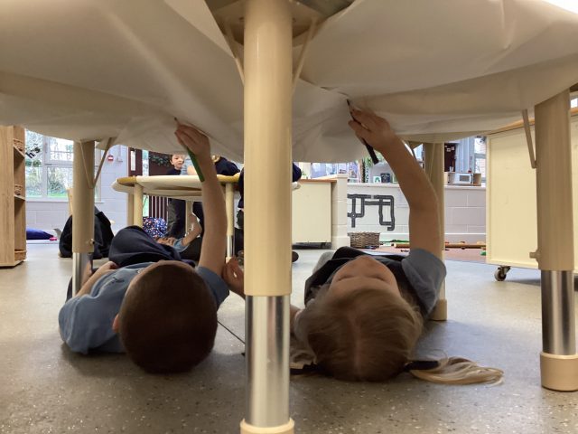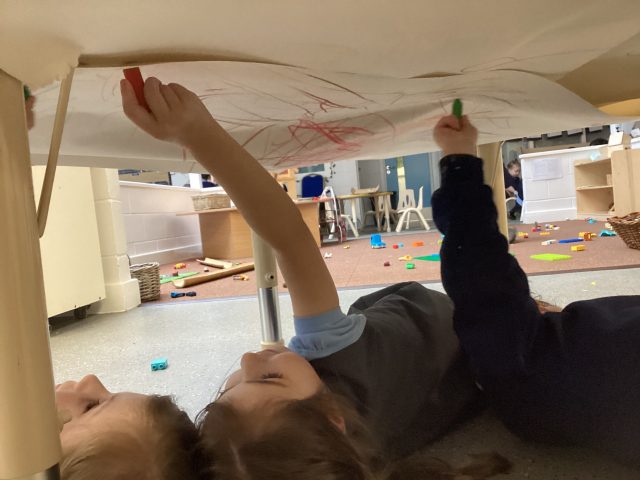 This afternoon, we are building our gross motor skills. We want to be wonderful writers, so we need to build our larger muscles (like our arms sand shoulders), before we can build our smaller muscles (like our fingers). So we wrapped our tables in paper, lay on our backs and got creative!