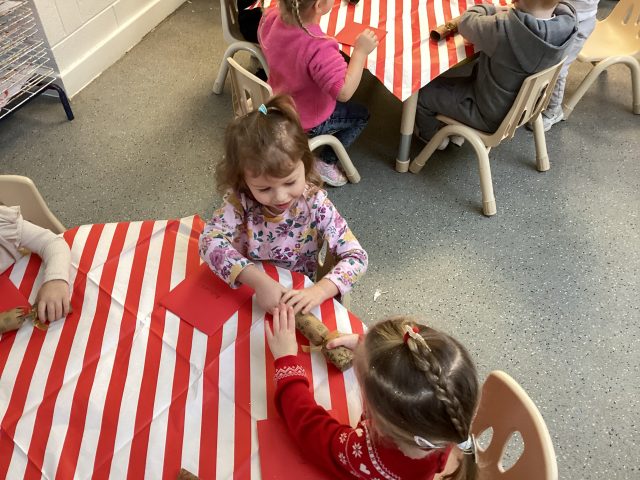 We made a reindeer this week! Constructing with different foods is a really tricky skill. It requires steady hands, patience, but there is also an element of speed too before the ingredients start to melt! The children did an amazing job, and they tasted pretty good too!