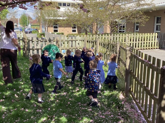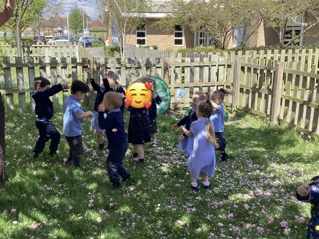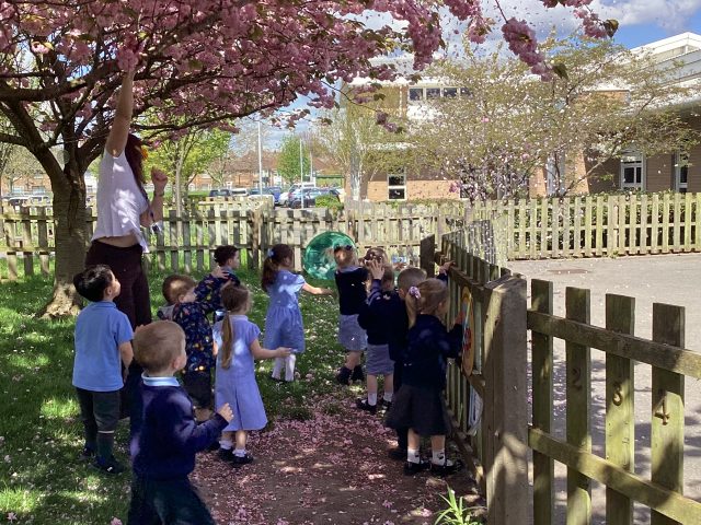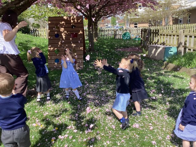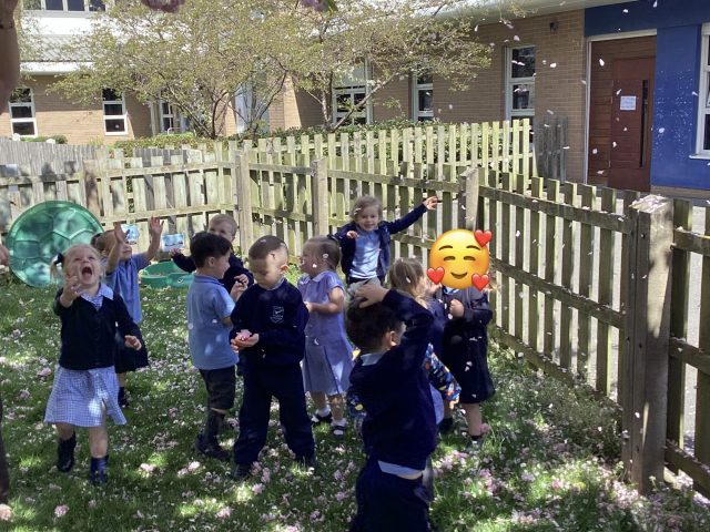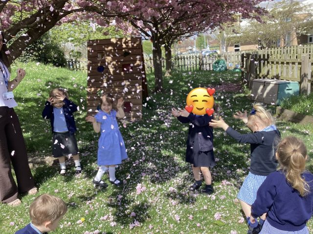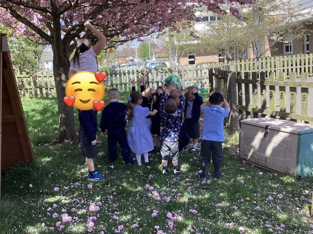 We noticed that the trees had blossomed over Easter half term! We had so much fun exploring the blossom that had already fallen…and the blossom that was ready to fall 😉