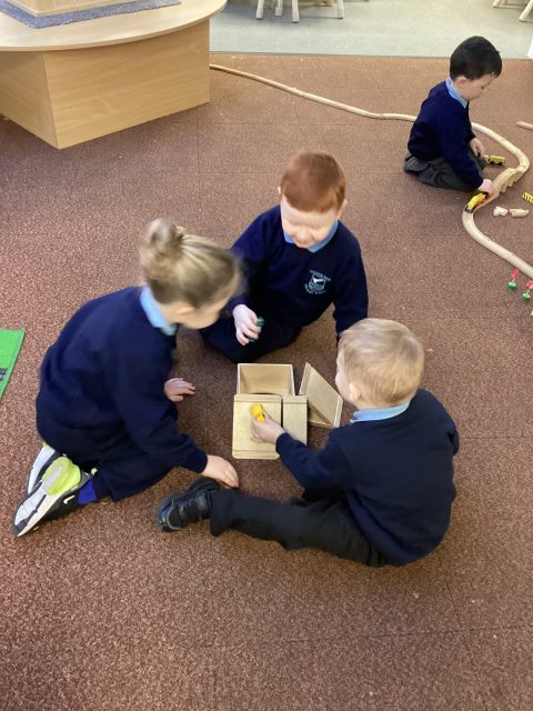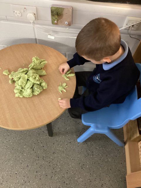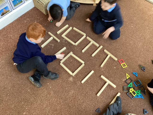We have been learning about number 2: recognising the numeral, subitising when there are two objects and the composition of number two. The children had a challenge – go and find two objects. They didn’t need to match, but they needed two. The children quickly made a link and realised that they had two hands – if they had one object in each hand, they had completed the challenge!