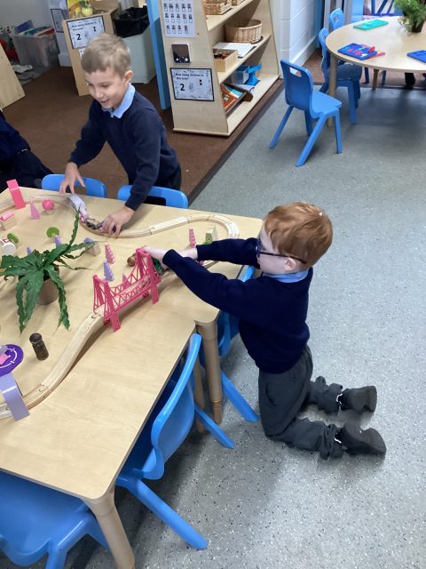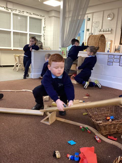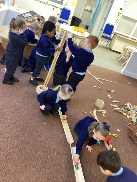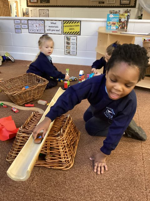 The children began to build ramps for the cars this morning, but the cars were not moving as fast as they’d like. They started to look around the classroom for resources to make the ramps bigger – and they found the water runs! The children quickly noticed that the higher the ramps, the faster they went! They worked together as a team to build different ramps.