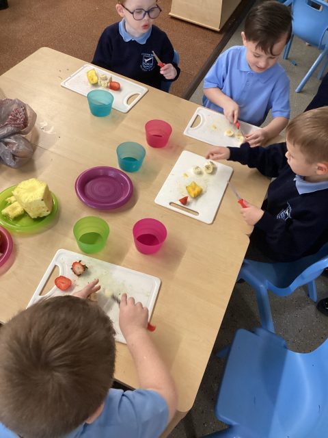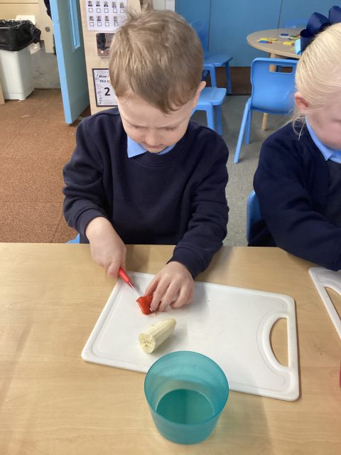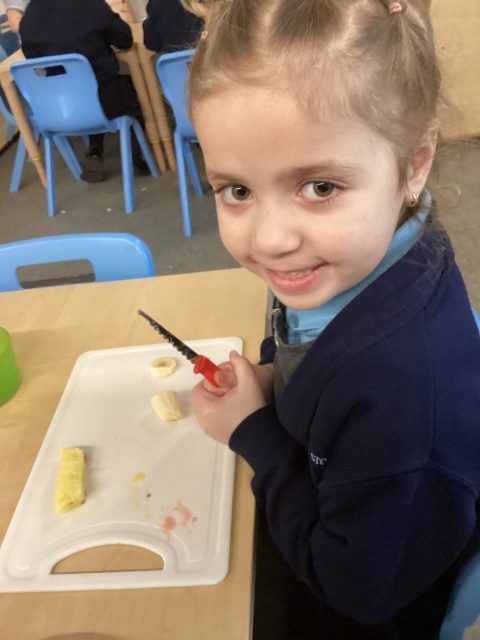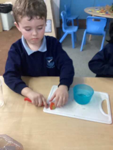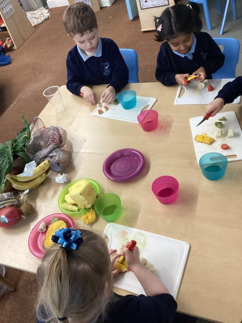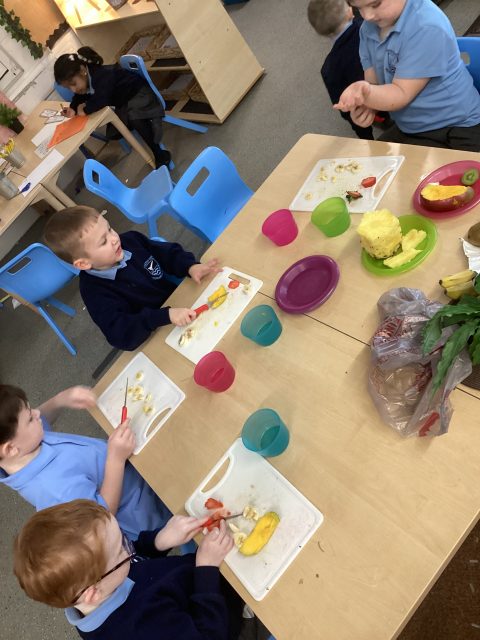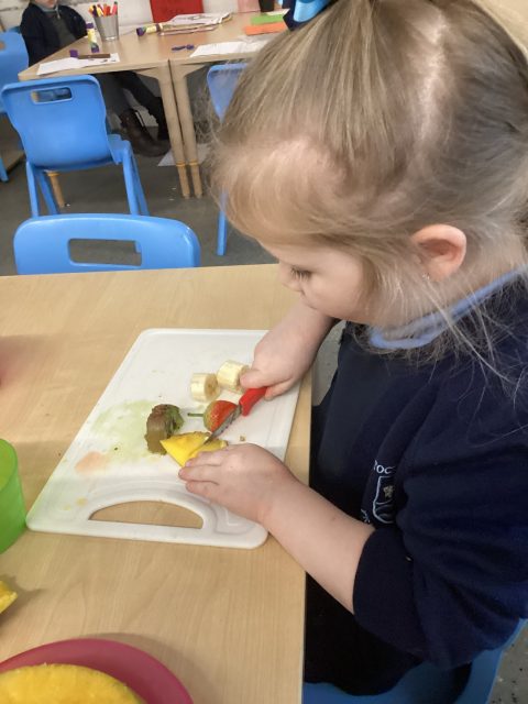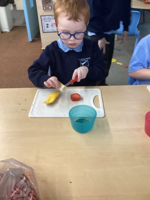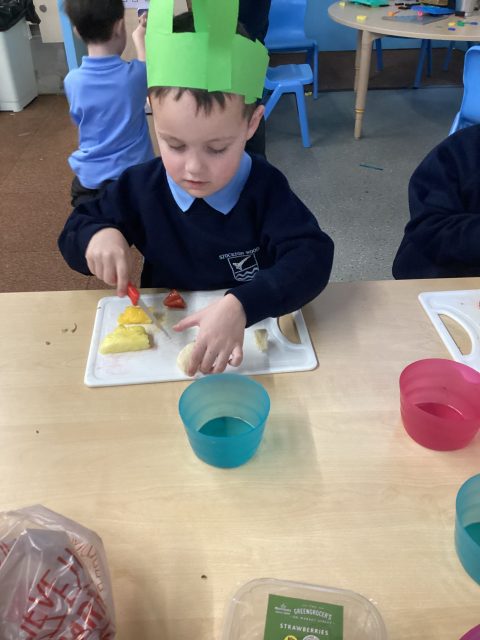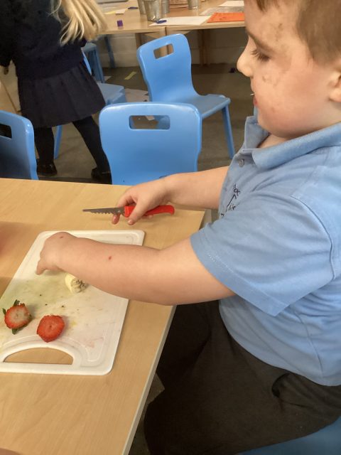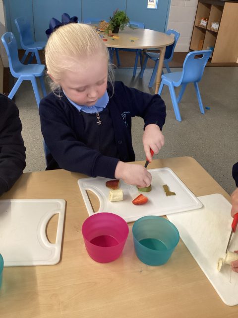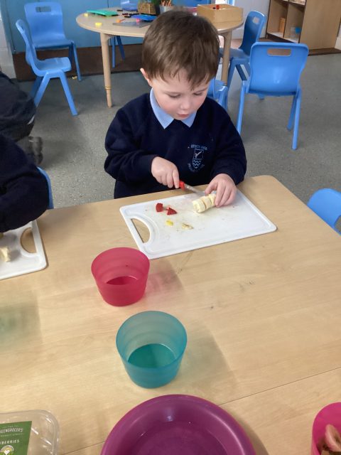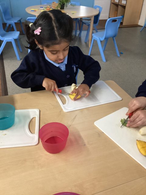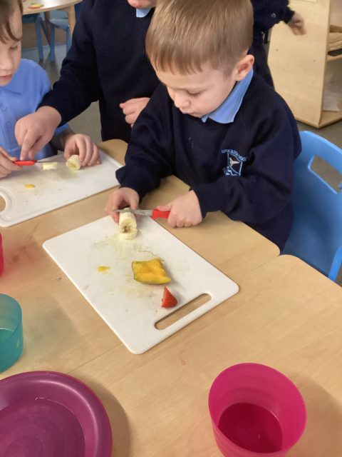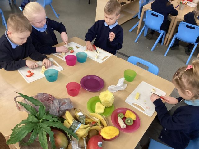 For DT week reception have made a fruit salad. They used a knife to cut up the different fruits. We had mango, banana, strawberry, pineapple and kiwi. After making our fruit salad we tried the different pieces of fruit.
