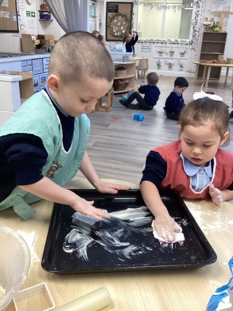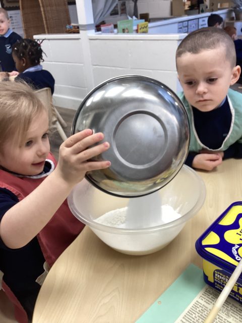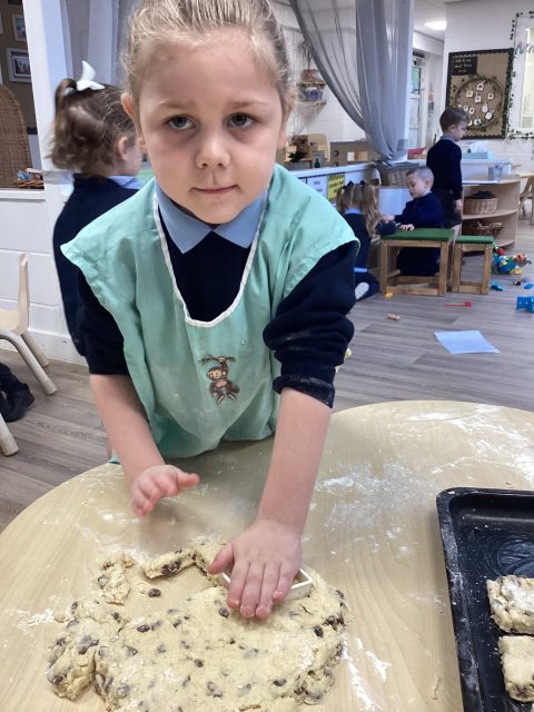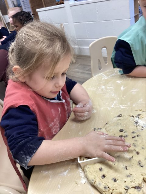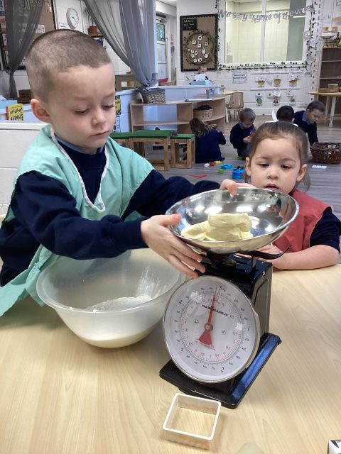 On the menu this week…scones! Wow they created a wonderful smell in Nursery! We carefully weighed the ingredients to make sure we had the right amount and worked together to mix it all together. They were delicious 😋