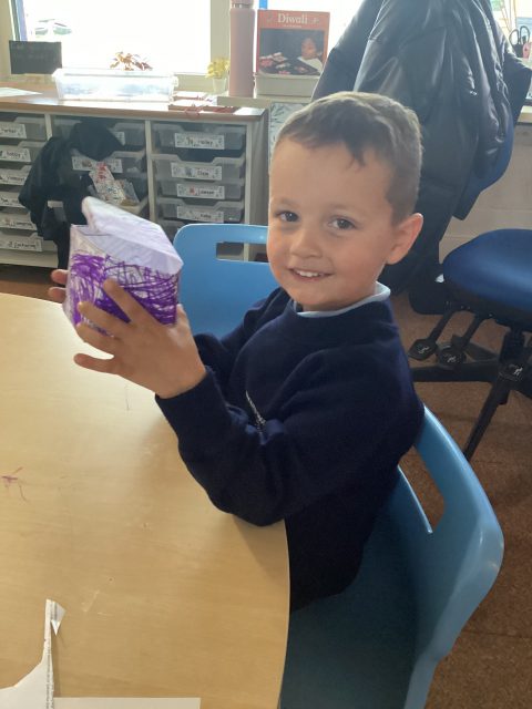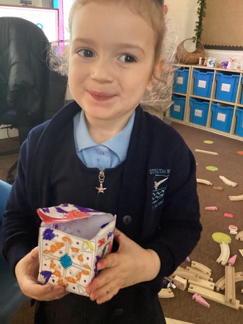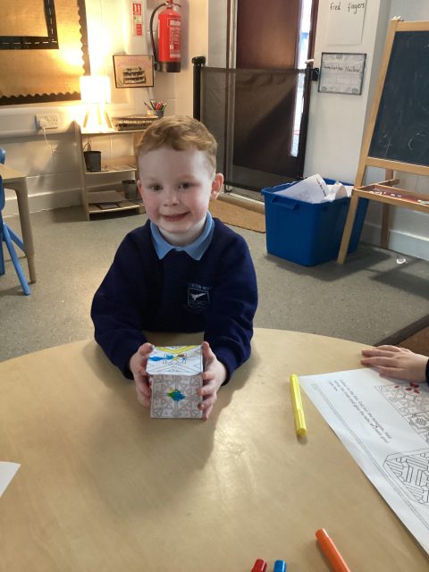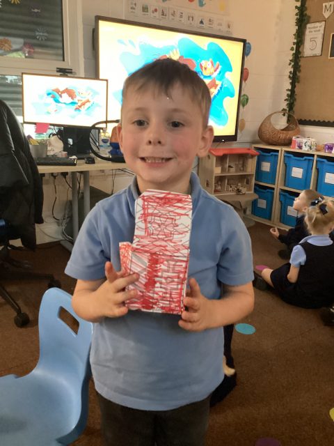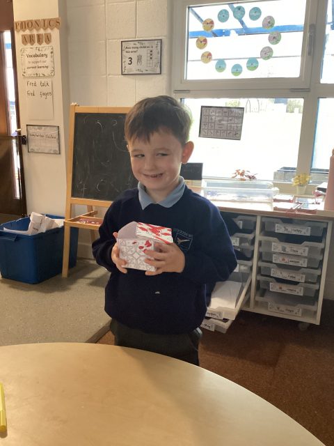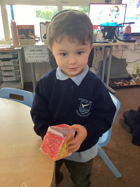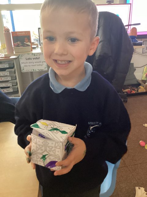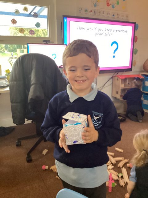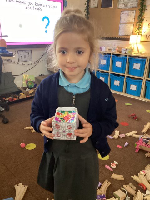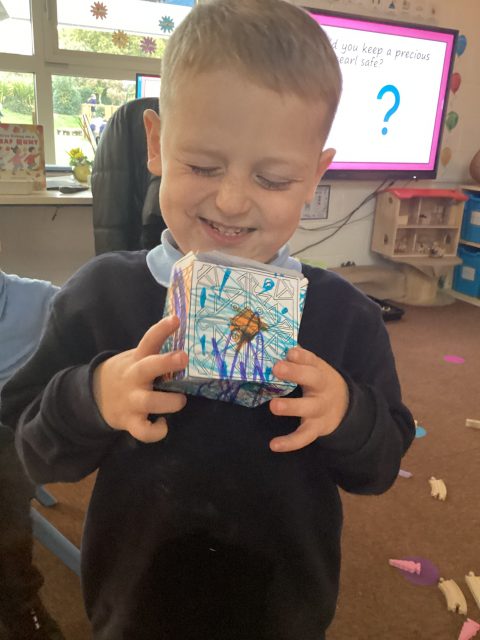 In RE this week Reception have read the story of the Precious Pearl from the Bible. We discussed what Christians believe this story symbolises and why it is an important parable to Christians. We created a box to put our own precious things inside to keep safe. We used; card, scissors, glue and felt tip pens to create our boxes.