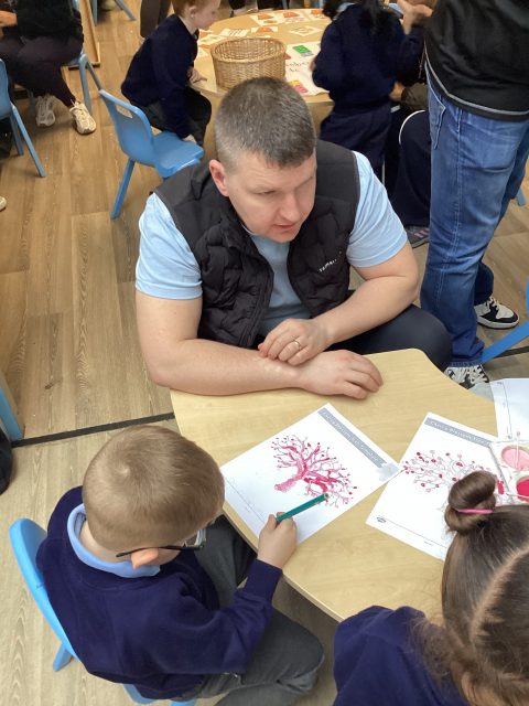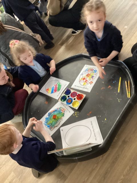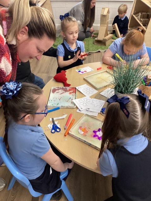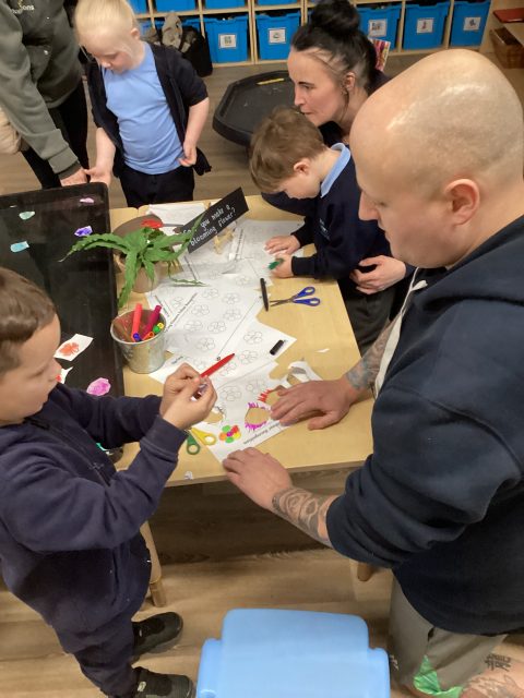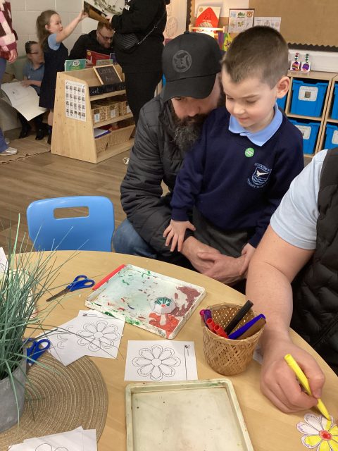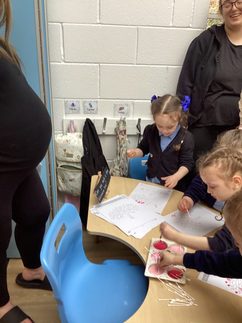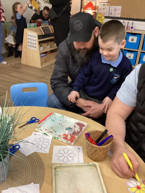 Reception had a fun afternoon with their adults! We showed our adults our classroom. We took part in different activities such as; colour mixing, flower blooming, Easter egg designing, tulip printing and tower building with 3D shapes!