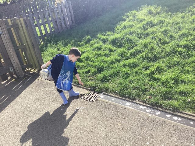 When tidying up, we noticed that the water was travelling down the gulley into the grid! We could see all the tiny pieces of dirt and dust travelling quickly towards the grid – it was fascinating to watch. We noticed there was a blockage in the drain, and H said “if we get it out, the water will go faster!” So we used some tools, removed the blockage and…H was right! It did move faster!