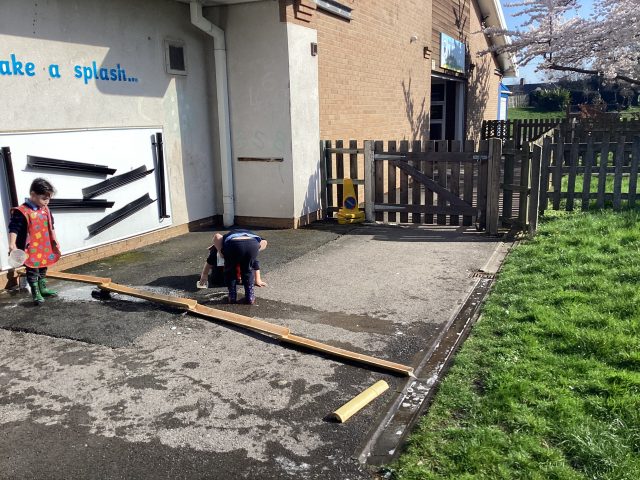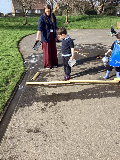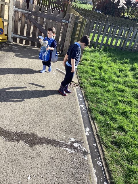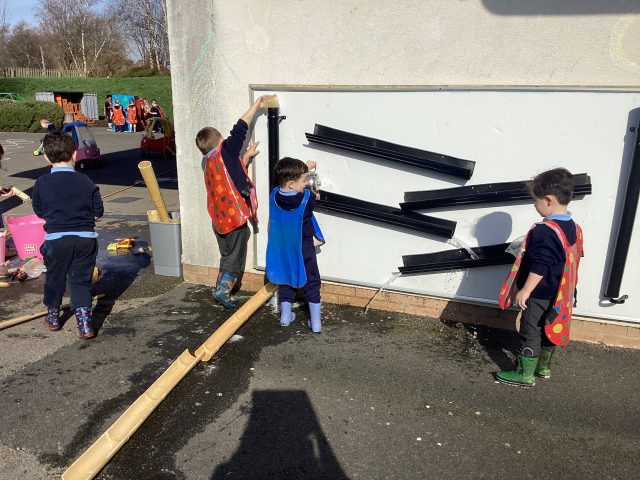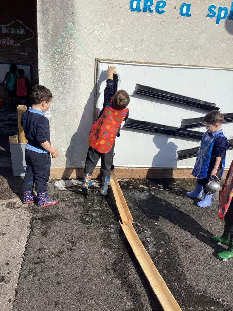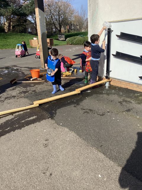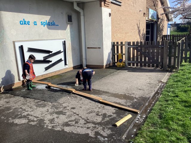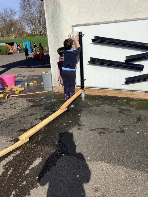 We are taking full advantage of the beautiful sunshine today! The children wanted to change the direction that the water was taking out of the water chutes, so we built a water run! We had to look really carefully at how the water travelled to make sure it didn’t run the wrong way. We used different things to prop it up, and spent some time testing it at each stage before successfully getting the water