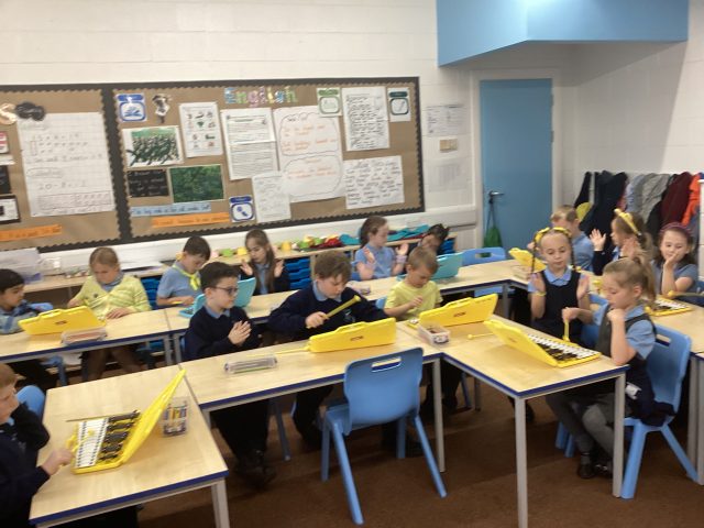Year 2 learnt the song ‘sunshine’ before improvising with our instruments. Here we are warming up for our music lesson.