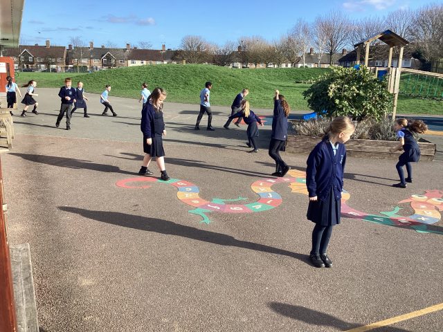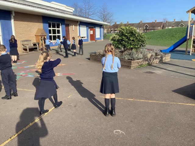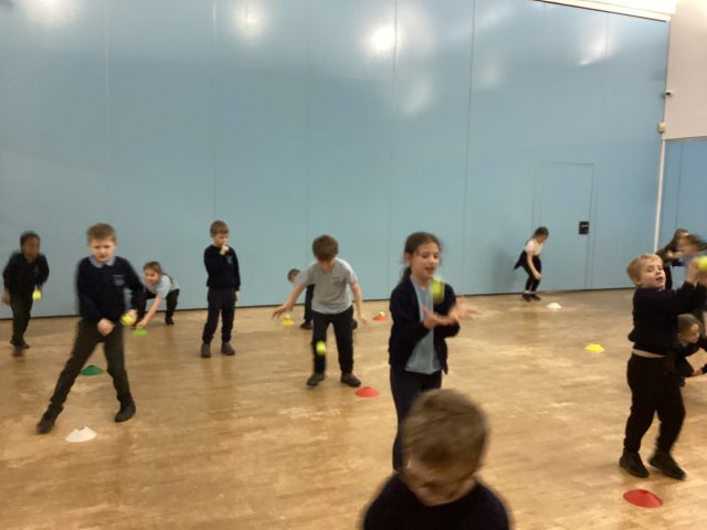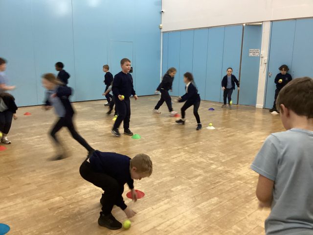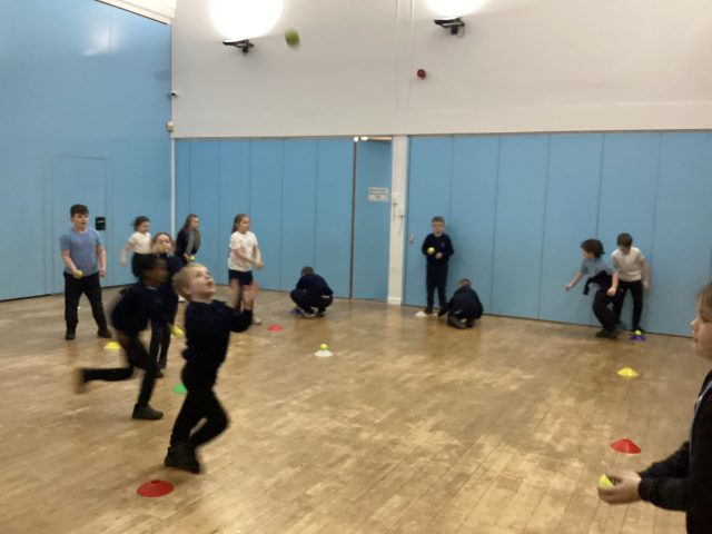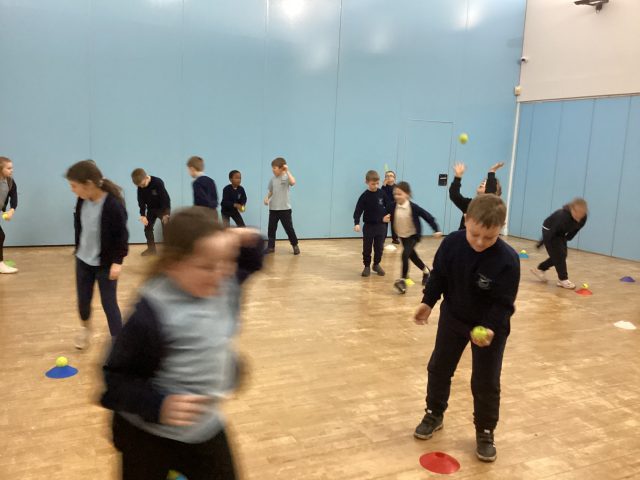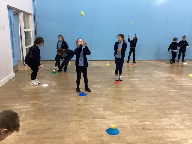 In P.E. this week, we started our new topic – cricket. We practised throwing and catching and making runs from cone to cone.