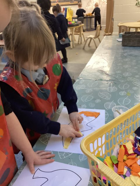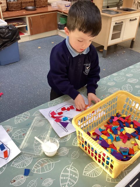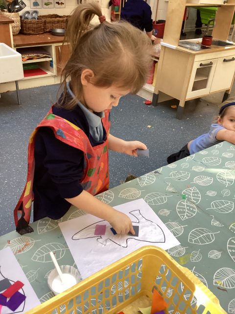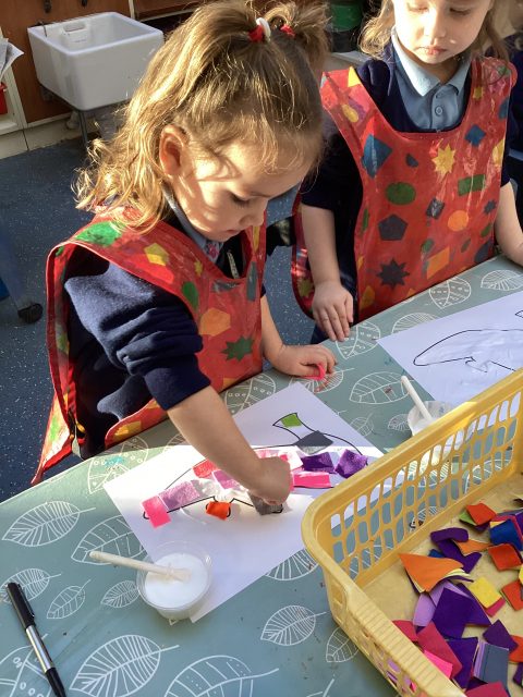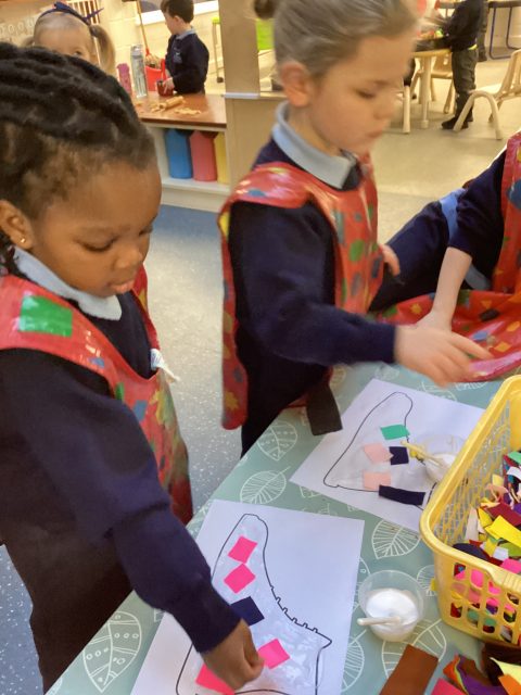 Art week continues…our driver text this half term is ’The Elves and the Shoemaker’ so we decided to collage some shoe templates! Spreading the glue was a little messy, but we are learning, so mess is okay! We talked about the colours that we were using.
