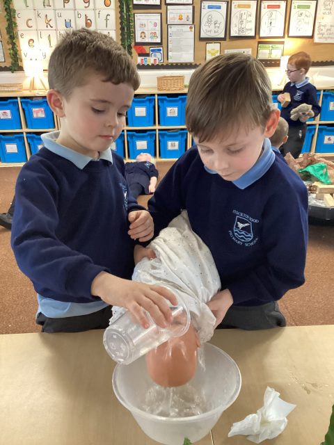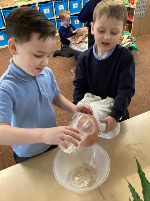 Today reception have explored changing materials! Today we turned cream into butter and buttermilk. We shook the cream until it separated into butter and buttermilk. We can’t wait to use our butter tomorrow for our crackers for snack!