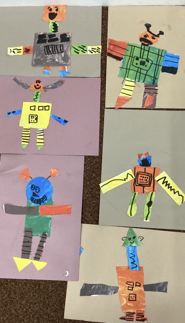 Today we explored 2D Shapes and sorting them in different ways. We went on a shape hunt around our class and found lots of items in our class that were 2D shapes. We then used our collage skills and created 2D shape robots.