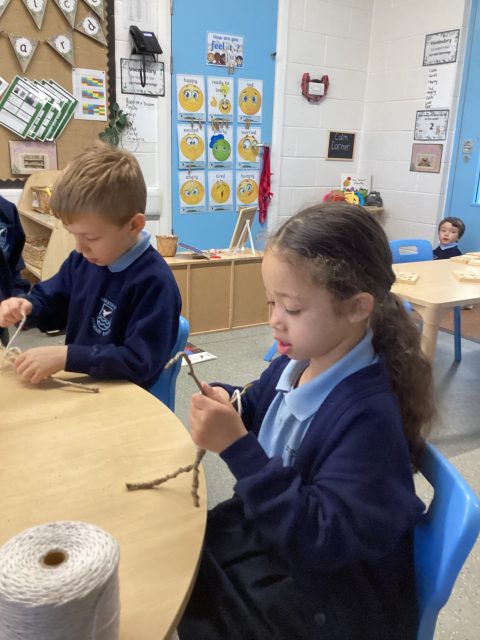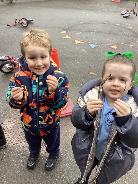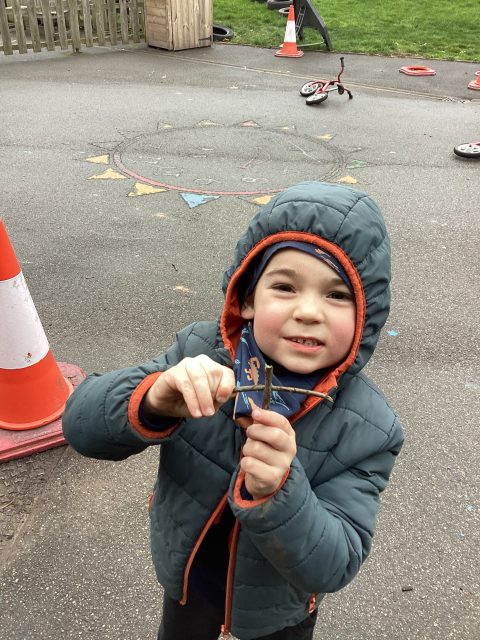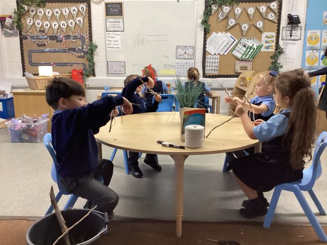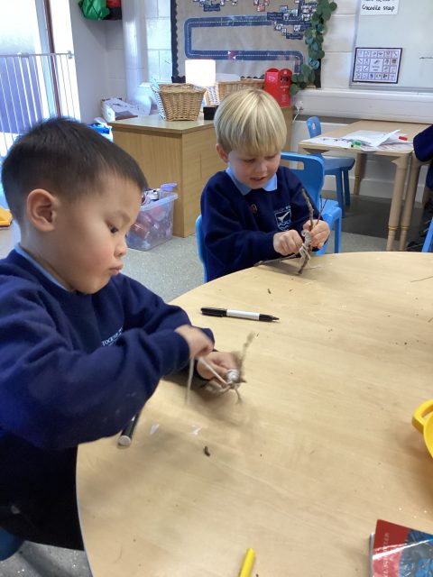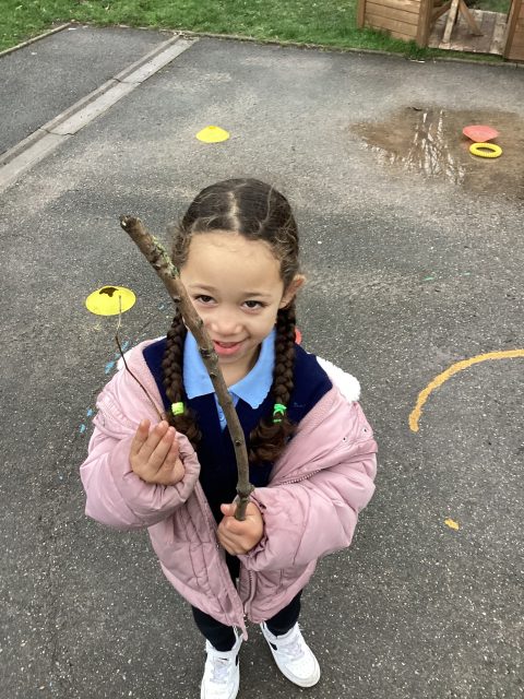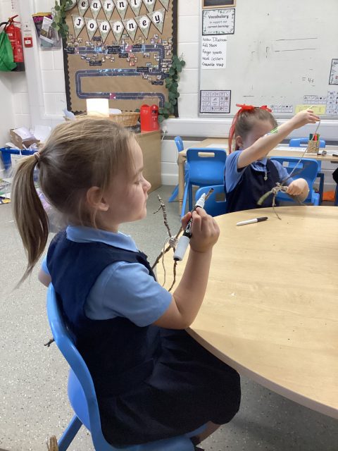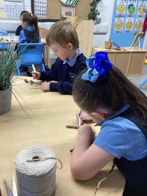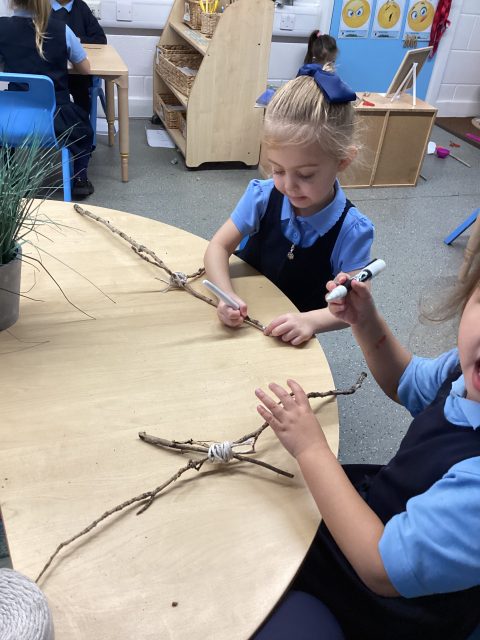This week we also explored the book Stick Man. We went into our outdoor environment to collect sticks, which we used to make our very own Stick Man models. Using our DT joining skills, we attached the sticks together with string. Finally, we added faces to complete our Stick Man.