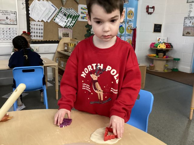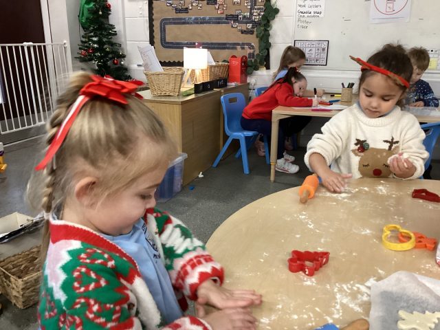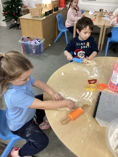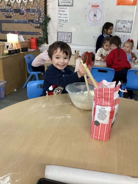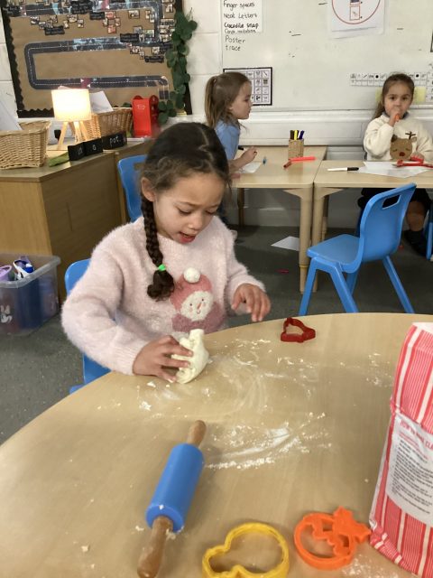 Today reception have made their own Christmas decorations out of salt dough. We added salt, flour and water to a bowl. Then we mixed them together and rolled them out using a rolling pin. We used different moulds to create our own decorations.