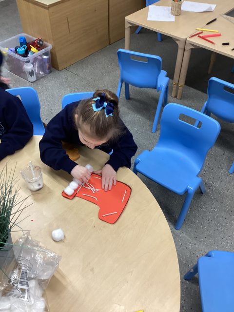 We have been making lots of different crafts for Christmas. We made calendars, cards, reindeer dust, snow globes, and stockings. We had lots of fun using our imagination and creativity while making these crafts.