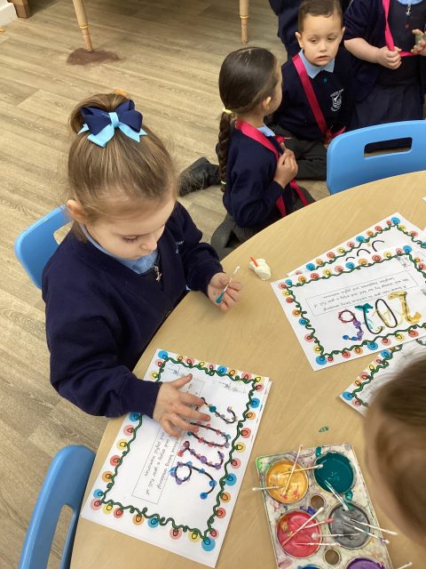 Today we’ve been painting our desk tidies. We created them yesterday using nets for 3D shapes.