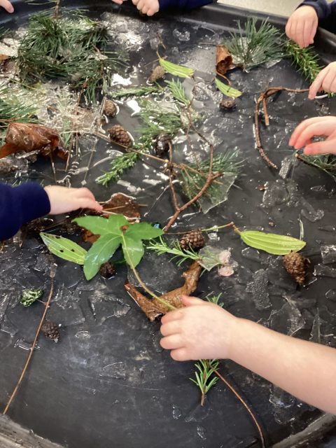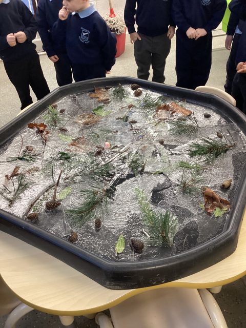 We found lots of Autumn things trapped inside some ice! We explored how to get them out, using the warmth from our hands. We listened to the cracking noises the ice made when we snapped it.