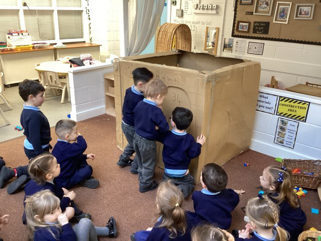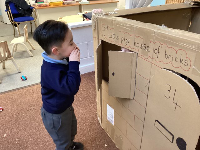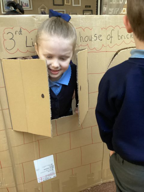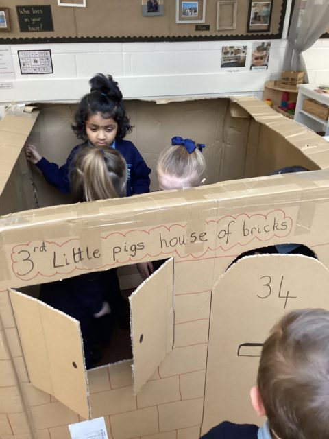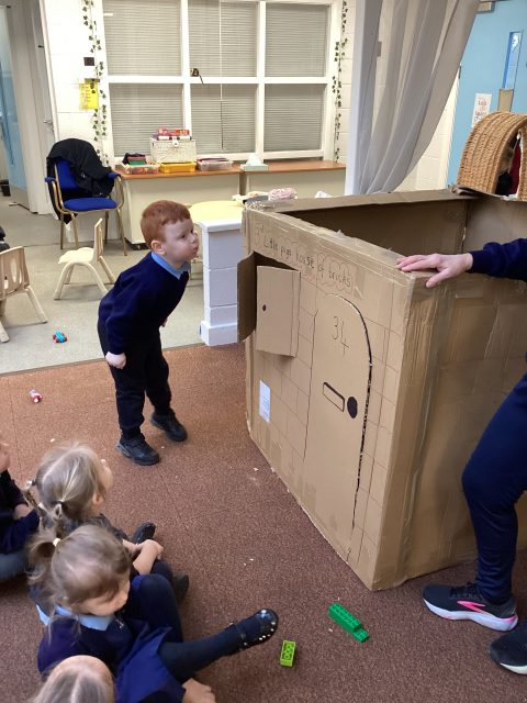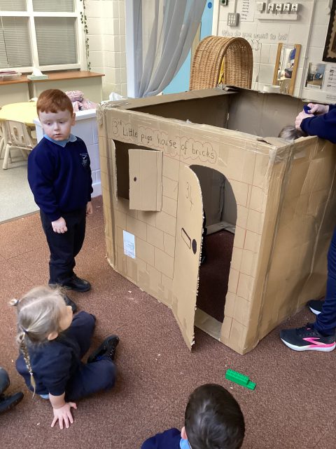 Mr Boyd surprised us with some huge boxes, so we did what we do best…we turned them into something really fun! We have been learning about the three little pigs story, and so Mrs Sefton got to work and with the help of the children, we created the 3rd little pigs house of bricks! 🧱 The children loved retelling the story together
